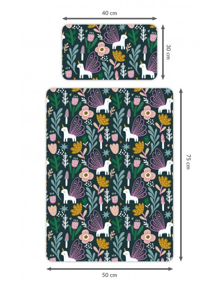 Ten wyjątkowy zestaw zawiera pościel z wypełnieniem oraz płaską poduszkę. Kołderka o rozmiarze 50 cm x 75 cm zapewnia ciepłe i przytulne otulenie, a płaska poduszka o wymiarach 30 cm x 40 cm gwarantuje prawidłowe ułożenie głowy dziecka podczas snu.